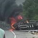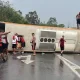 Um caminhão com carga de suporte de televisão de videoconferência tombou ao lado de uma ribanceira e pegou fogo no km 315 da BR 101, em Vila Velha,...