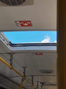 Nesses dias de intenso calor, um dos ônibus da Viação São Gabriel inovou. Arrancaram a tampa do teto por onde controla a entrada de ar para refrescar o interior do veículo e amenizar o calor.