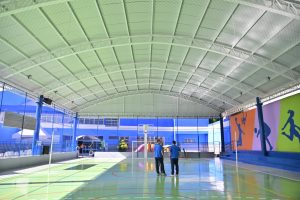 A quadra da escola também foi totalmente revitalizada, com substituição da cobertura e da estrutura metálica, instalação de novo piso com pintura em tinta epóxi, novas traves e tabelas de basquete, tratamento e pintura da arquibancada e troca de todo o alambrado.