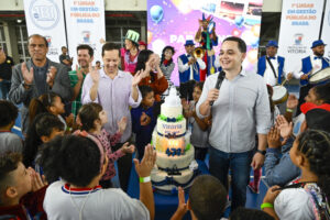 Quem também esteve no evento para cantar os parabéns para Vitória foi o prefeito da capital, Lorenzo Pazolini. Pazolini ainda brincou com as crianças e deu uma volta na quadra com a banda Fanfarra.