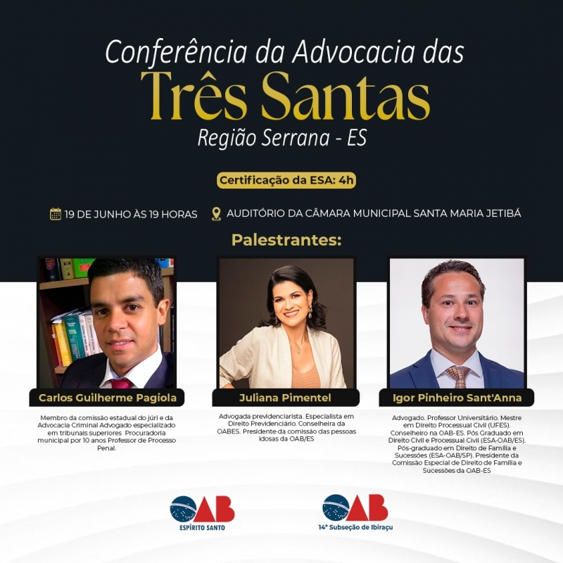 A promoção do evento é da Seccional da OAB-ES, em parceria com a 14ª Subseção de Ibiraçu, que vai ser realizada dia 19 de junho (quarta-feira), no auditório da Câmara Municipal de Santa Maria de Jetibá, com início às 19 horas.