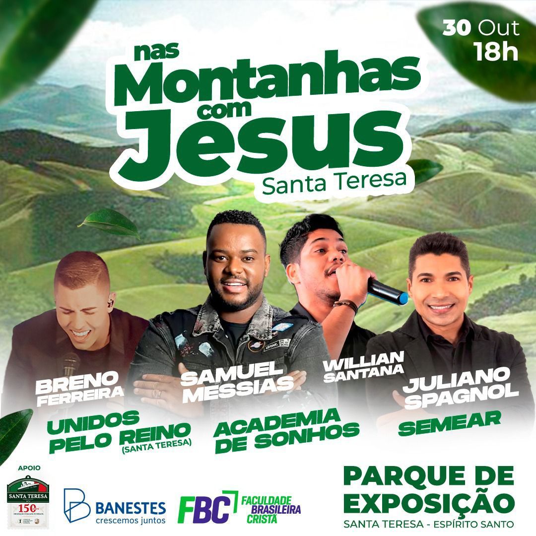 Para quem gosta de curtir bons momentos em família e desfrutar de lugares incríveis, vale a pena um passeio à região serrana do Espírito Santo, mais precisamente a Santa Teresa, aonde vai acontecer, no próximo dia 30, o evento “Nas Montanhas com Jesus”. Será no Parque de Exposição, com início às 18 horas.