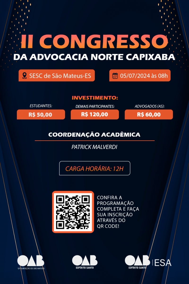 A OAB-ES, ESA e 12ª Subseção de São Mateus realizam o 2º Congresso da Advocacia Norte Capixaba, no dia 05 de julho (sexta-feira), no Sesc de São Mateus.