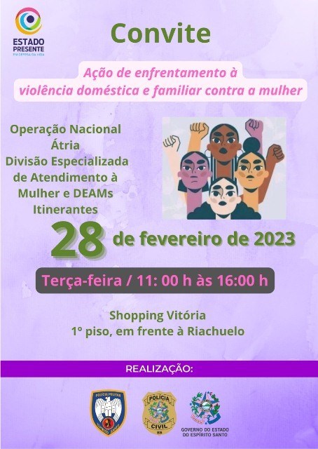 A Polícia Civil do Espírito Santo (PCES), por meio da Divisão Especializada de Atendimento à Mulher (DEAM), vai realizar uma ação, nesta terça-feira (28), para o enfrentamento à violência contra a mulher. A ação contará com a participação de todas as Delegacias Especializadas de Atendimento à Mulher (Deams) da Grande Vitória e acontecerá no Shopping Vitória, localizado na Capital.