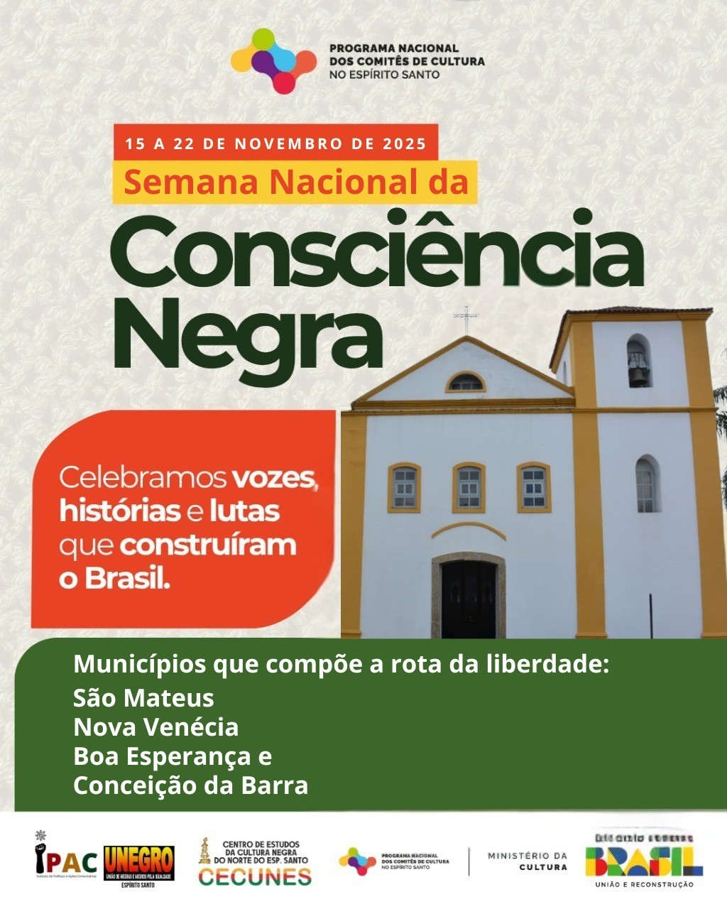Os municípios de São Mateus, Nova Venécia, Boa Esperança e Conceição da Barra que compõem a Rota da Liberdade, tem vasta programação para comemorar a Semana Nacional da Consciência Negra.