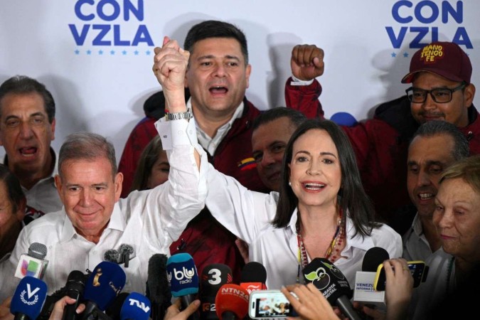 Em meio a uma guerra de pesquisas de boca de urna divergentes, a líder opositora María Corina Machado, aliada do candidato Edmundo González Urrutia, da coligação Plataforma Unitária Democrática, convocou a imprensa e fez um apelo para que os eleitores permaneçam nos centros de votação, em todo o país.